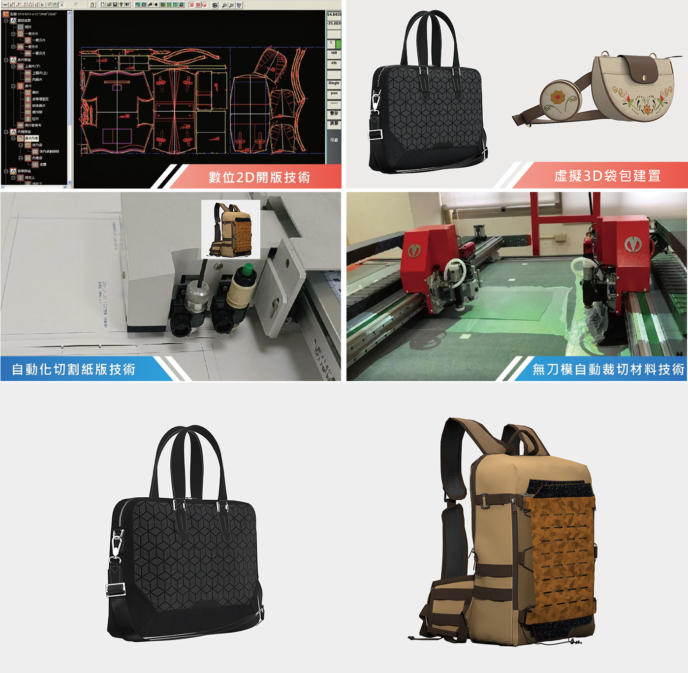 ● 手開紙版轉換數位紙版 ● 數位2D開版技術 ● 自動化切割紙版技術 ● 無刀模自動裁切材料技術 ● 虛擬3D袋包建置 ● 袋包製樣開發 ● 公版應用製樣
